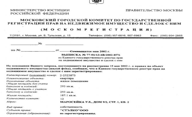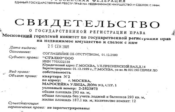Для того, чтоб рассказать о сложной судьбе хотя бы одного крупного актива (пакетах акций "Газпрома", например) нужно писать многотомник. Попробуем, в качестве иллюстрации, проследить за "движением" небольшого объекта - квартира, 12 комнат, адрес: г. Москва, ул. Маросейка, д. 9/2, кв.2
