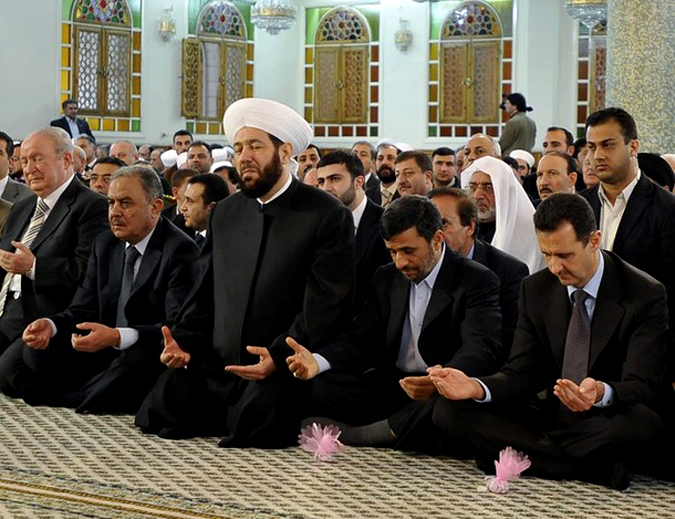 От редакции: Мелкие неточности не в счет: пурпурный плащ базилевсов несколько старше Христа, а богом православный император никогда не считался (в отличие от императора в языческие времена), только лишь главой церкви, что не одно и тоже. Но в чем вина Асада? В том, что он атеист? Но мне кажется, что автор и сам не очень большой сторонник теократического государства... К тому же Асад будучи сам человеком сугубо светским, к воинствующим атеистам никак не относится. Вот даже фоточка есть в подтверждение.