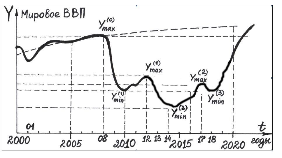 В соответствии с этим графиком мировой ВВП, колебавшийся до 2008 года вокруг пунктирной линии обозначенной Y(o), резко ушел вниз, изменив картину развития мировой экономики. Спады и подъемы на этом графике - это не произвольно нарисованные кривые, а тщательно просчитанные факторы изменений мировой ВВП. Все дело в том, что примерно, раз в полвека вхождение в фазу падения сразу четырех экономических циклов разной продолжительности совпадают по времени и возникает эффект резонанса. Так в 2007-2008 гг. возник эффект резонанса, когда в циклах: Китчина, Жюгляра, Кузнеца и Кондратьева практически одновременно были пройдены верхние пиковые точки развития, и началась фаза спада.