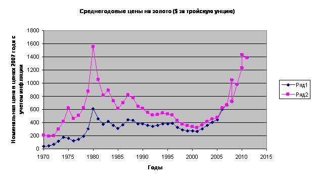Предыдущая понижательная волна пятого К-цикла начиналась с резкого роста цен на нефть и золото. Тогда официальная цена на золото до 1971 года была равна 35, а рыночная - 42-44 $ за унцию, но в разгар (1980г.) понижательной волны пятого К-цикла она достигла уже 615 $ за унцию, т.е. увеличилась почти в 18 раз. Цена же на нефть только с 1973 по 1975 годы повысилась в 6,4 раза с 1.8 до 11,5 $ за баррель (причем объемы потребляемой нефти в мире в это время существенно уменьшились), а к концу понижательной волны пятого К-цикла поднялась до 37,4 $, т.е. выросла более чем в 20 раз (при этом объемы потребления снова падали). Движение цен на золото и нефть просто поражает своей синхронностью (см. графики).