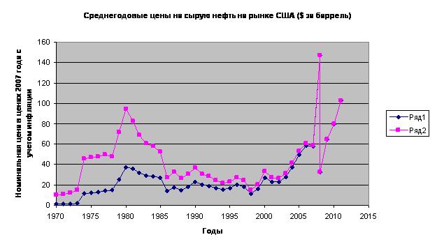 И только, начиная с 2004-2005 гг., в соответствие с продолжающимся ростом спроса на нефть их цены резко пошли вверх. Но этот рост свидетельствовал о том, что 24-летняя повышательная волна пятого К-цикла «успешно» завершилась, и мировая экономика вступает в фазу понижательной волны шестого К-цикла, которая продлится 10-15 лет. Приведенные графики лучше любых пояснений демонстрируют этот вывод. Нижние линии на обоих графиках характеризуют рост цен в номинальном выражении, а верхние - с учетом инфляции.