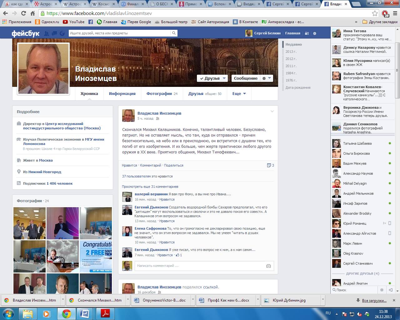 Вот что написал (скриншот страницы Иноземцева ниже, - похоже, она сделана в режиме "только для друзей") либеральный экономист Иноземцев по поводу смерти Калашникова: "Скончался Михаил Калашников. Конечно, талантливый человек. Безусловно, патриот. Но не оставляет мысль, что там, куда он отправился - причем безотносительно, на небо или в преисподнюю, он встретится с душами тех, кто погиб от его изобретения. И их больше, чем жертв практически любого другого оружия в ХХ веке. Приятного общения, Михаил Тимофеевич..."