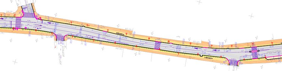 Оба тротуара с двух сторон стараются сделать не меньше 4 м! «Чтобы прогуливались»? При этом по середине этого кусочка общее число полос движения сокращается до двух, а потом опять увеличивается до трёх.