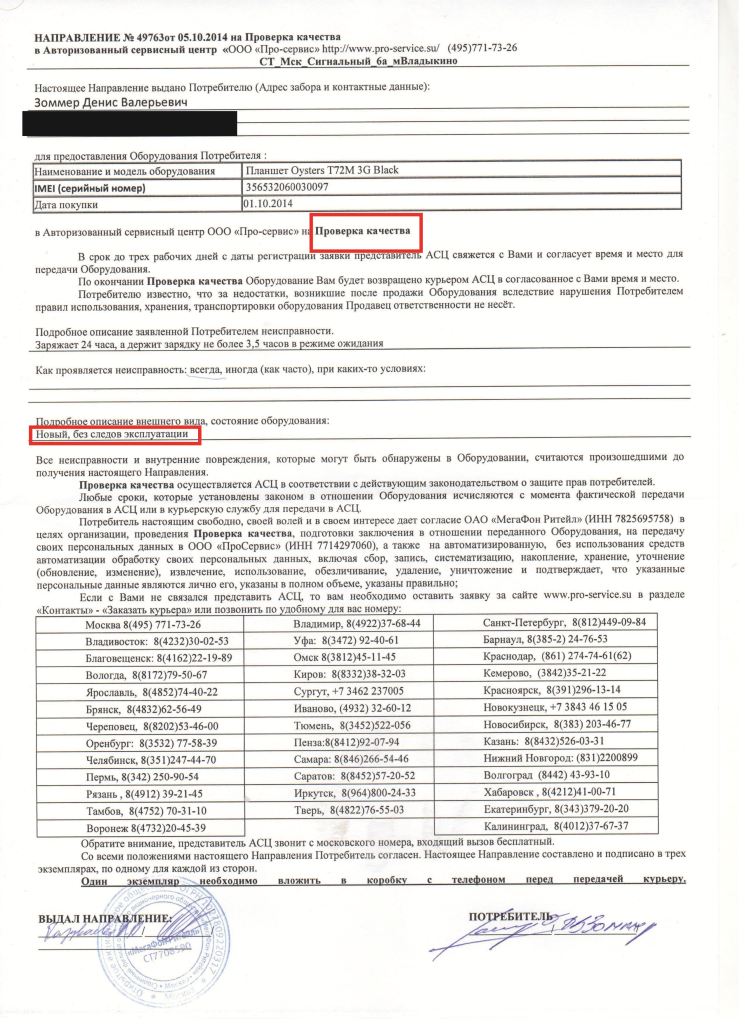 На этом приключение с "Мегафоном" не закончилось! Заметив, что выписан лист на ремонт, а не на диагностику с заменой устройства, я потребовал замены документа, который, не без зубовного скрежета, был переделан. После чего, письменно оставив претензию, я поинтересовался, когда менять-то станут мой планшет? На что никто так и не смог внятно ответить...