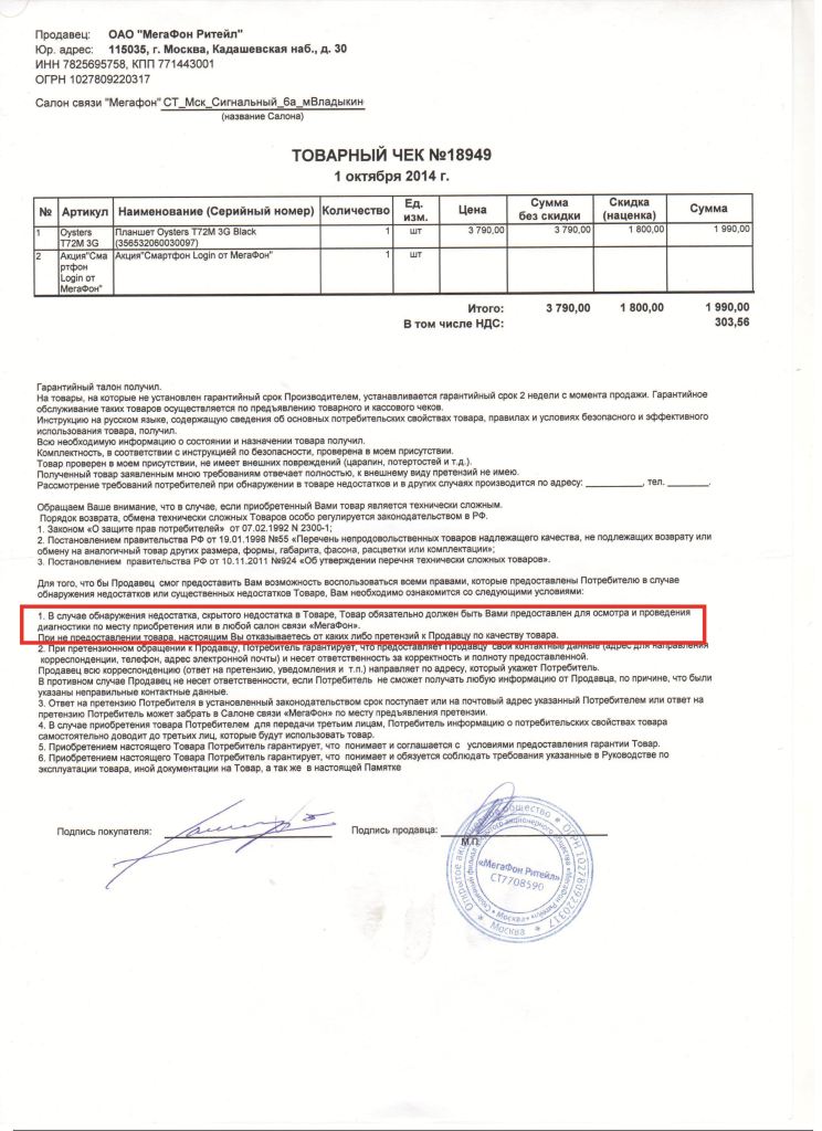 На это, как будто переменившись в любезности, она принялась меня убеждать в том, что я сам обязан отвезти его на экспертизу или ремонт по гарантии. В ответ я ей привел разумный довод в виде товарного чека, где в пункте первом обязанностей со стороны продавца говорится о необходимости приемки и диагностики продавцом, но никак не покупателем (потребителем).