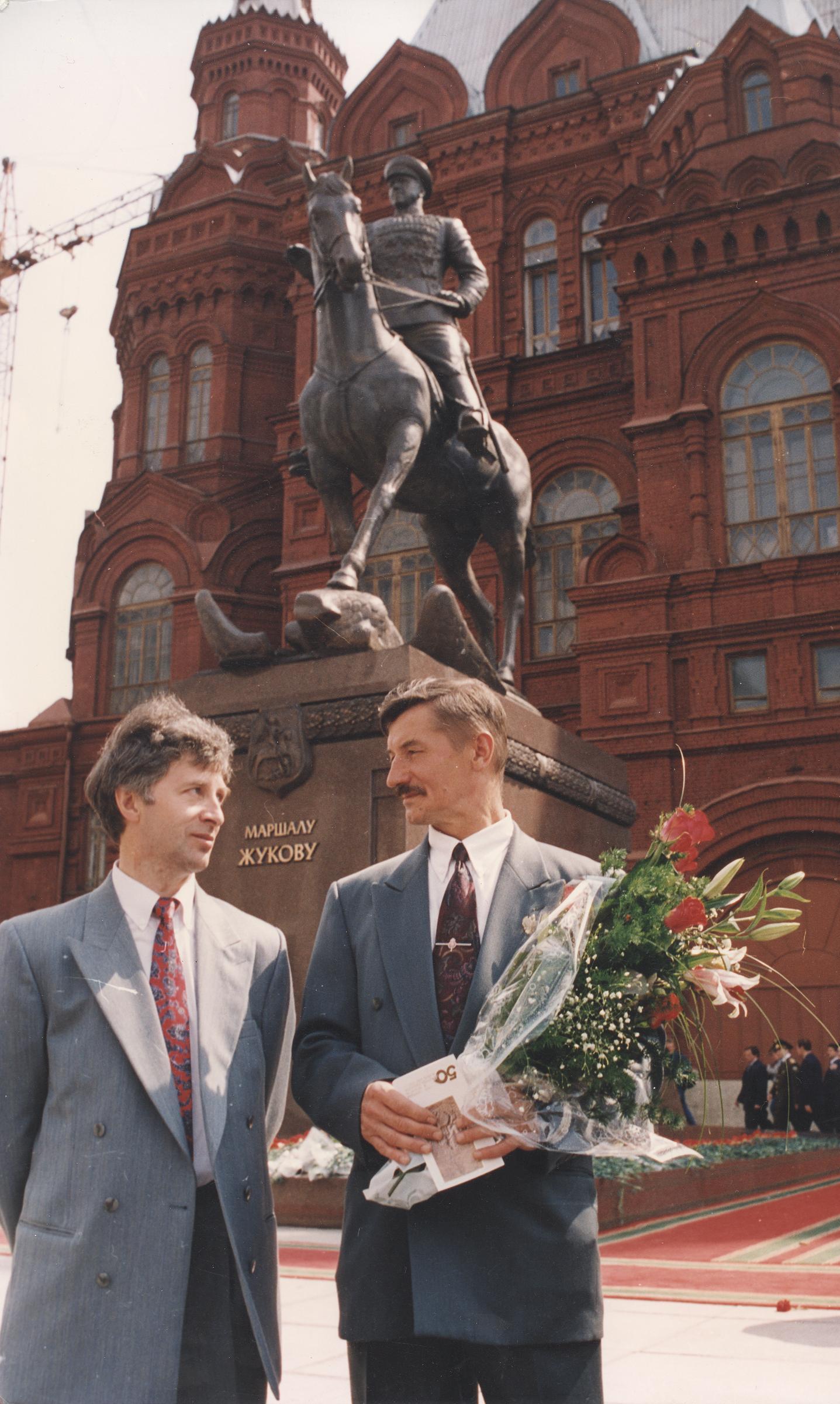 Москва эпохи перемен скульпторов не обижала – жаловала заказом и рублём. Вследствие чего иногда Лужков вносил свои барские правки. Например, на нижеследующем фото (Краснов - справа) виден изначальный проект памятника, где и рука у маршала естественнее, и нога у лошадки его не табуреточная (как прозвали её москвичи). Но вот как порой власть ухудшает памятники – и Жукову подняли повыше правую руку, и ножки лошади пришлось тоже «подверстать»…