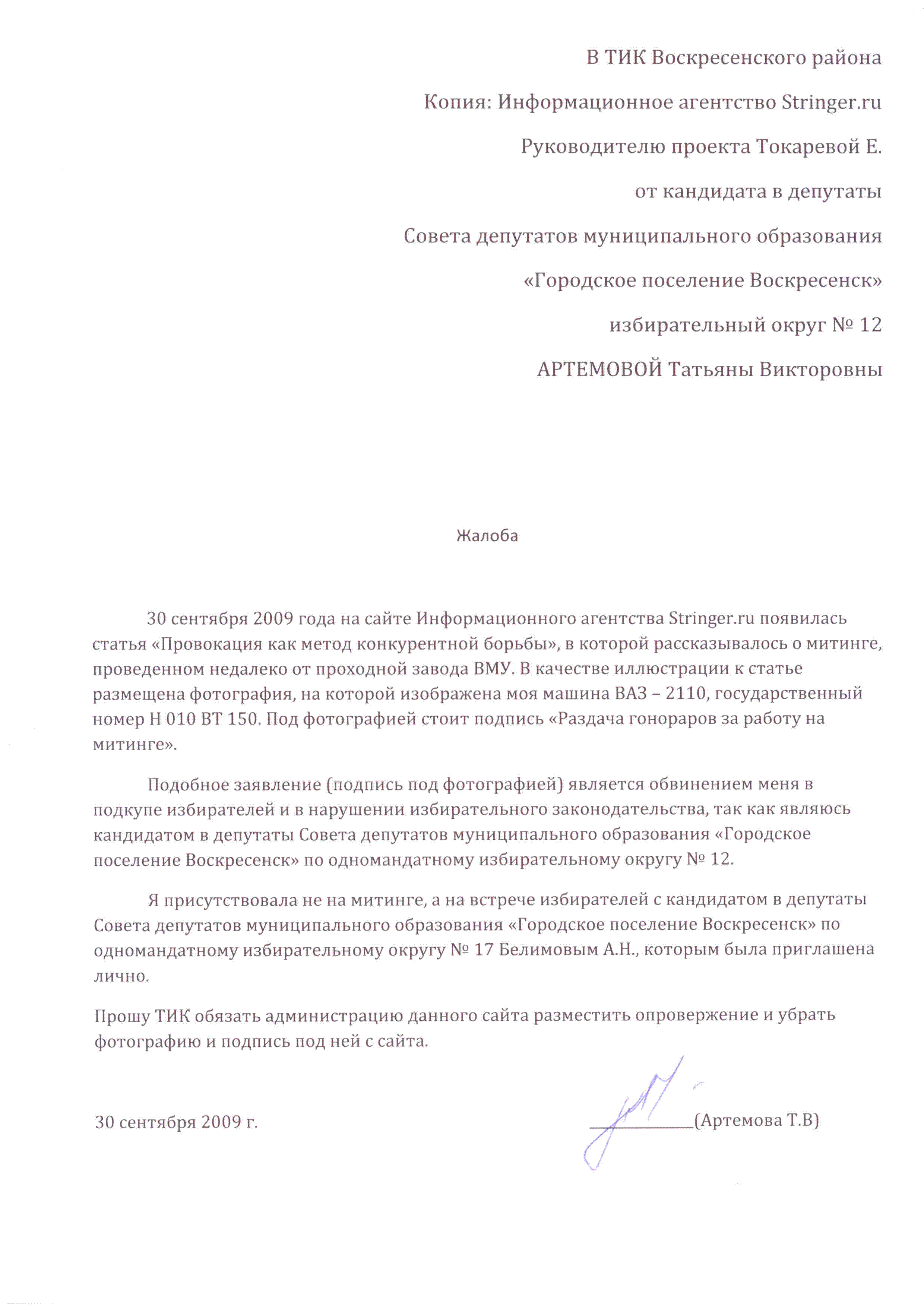 Заявление кандидаты в депутаты Татьяны Артемовой в Территориальную избирательную комиссию, копия в Stinger.RU: