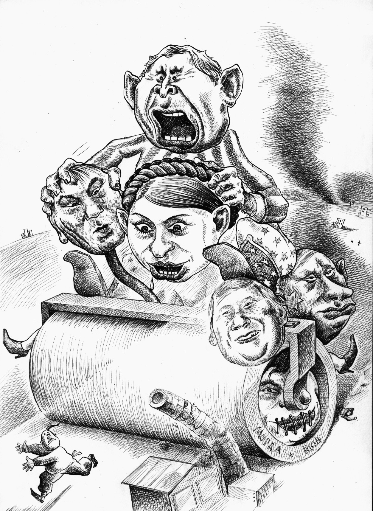А Рауль хотя и поставлен в жесткие рамки, рисовать карикатуры быстро, но все равно делает их тщательно, прорабатывая каждую черточку. Уж если он рисует винтовку, то точно можно сказать, что это винтовка Мосина или Маузера, если нарисует сапог, то не забудет подковки и гвоздики нарисовать. Казалось бы - кому это надо в карикатурах? Ему надо, а мне нравится. Люблю я тщательность...