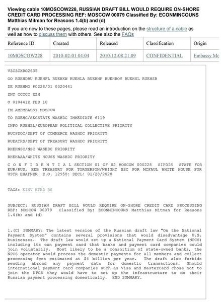 Государственный департамент США решил поддержать Visa и MasterCard. Об этом-то и рассказал в своем очередном сообщении WikiLeaks. В частности, этот скандальный сайт опубликовал секретную телеграмму, предназначающуюся советнику президента США по России Майклу Макфолу, которую направил ему представитель Visa, в документе обозначенный, как «Public Relations head». В телеграмме сотрудник Visa раскритиковал создание российской национальной платежной системы. Особенно Visa возмутили последствия возможной конкуренции с НПС.