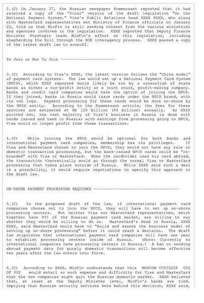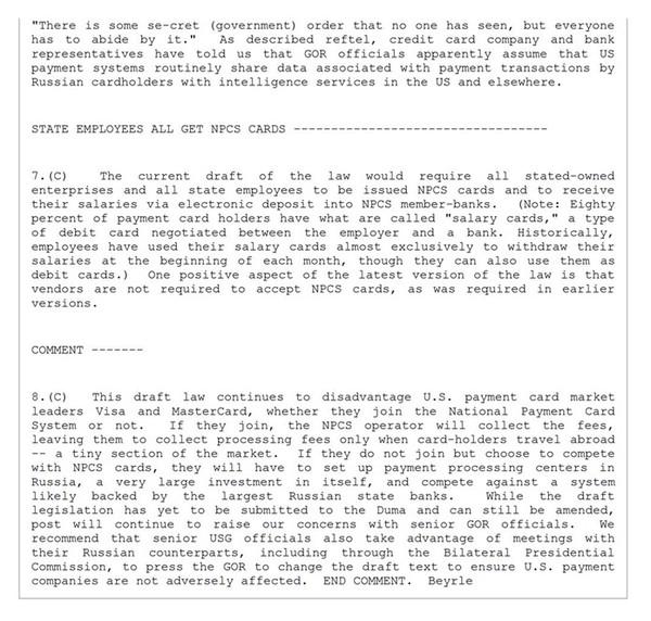 «Этот законопроект по прежнему ставит в невыгодное положение лидеров рынка платежных карт - Visa и MasterCard, - вне зависимости от того, присоединятся они к НПС или нет. Мы рекомендуем, чтобы высшие должностные лица правительства США попытались встретиться со своими российскими коллегами, в том числе в рамках двусторонней президентской комиссии, чтобы добиться изменения законопроекта с тем, чтобы гарантировать, что американские платежные компании не будут подвергаться нежелательному воздействию», - резюмировал автор послания советнику президента США по России Майклу Макфолу.
