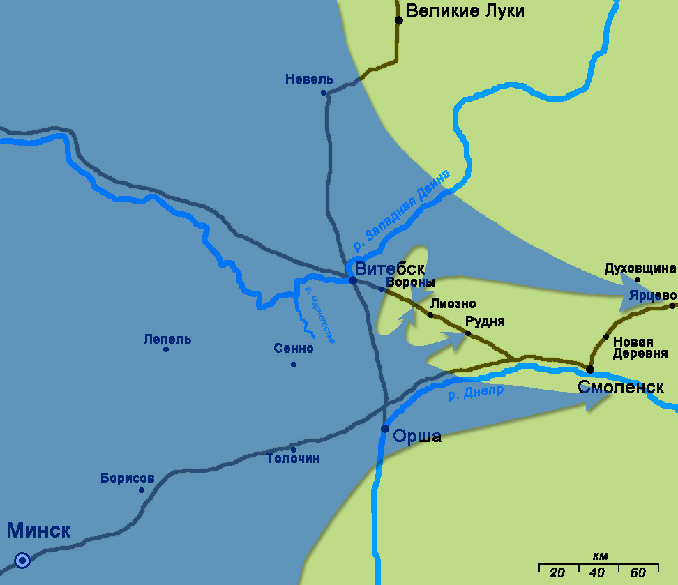 Есть еще довольно интересный момент. В некоторых описаниях этих боев встречается термин «Витебский котел», то есть, окружение советских войск под Витебском, но этот котел какой-то «неправильный». Для того, чтобы понять, что произошло, надо осью событий представить дорогу Витебск-Смоленск, идущую на восток с небольшим склонением на юг. Примерно в 75 км от Витебска находится местечко Рудня, между ним и Витебском, в 45 км от Витебска – местечко Лиозно. Немецкий фронт в этом месте, грубо говоря, шел с севера на юг у Витебска, а на флангах уже охватывал эту территорию и с юга, и с севера. И вот 14 июля немцы с юга наносят охватывающий удар на Рудню и захватывают ее, то есть, создается впечатление, что теперь ударом с севера на Рудню они замкнут котел с нашими войсками, длиною примерно в 70 км. И они действительно наносят удар с севера, но не на Рудню, и даже не на Лиозно, а севера на юг между Лиозно и Витебском. Получилось, что с юга немцы окружили 70 км, а с севера всего около 30, даже Лиозно оставалось в наших руках до 17 июля. Кольцо окружения по своей форме вместо цифры 0 стало похоже на обернутую цифру 6. В результате, войска Красной Армии, находившиеся севернее дороги Витебск-Смоленск, из этого «Витебского котла» просто выехали, в том числе и все части 14-й дивизии, не попавшие в окружение, были уже за Смоленском к утру 15 июля. В окружение из 14-й попали только мотострелковый полк и второй дивизион 14 ГАП. Но это не все.