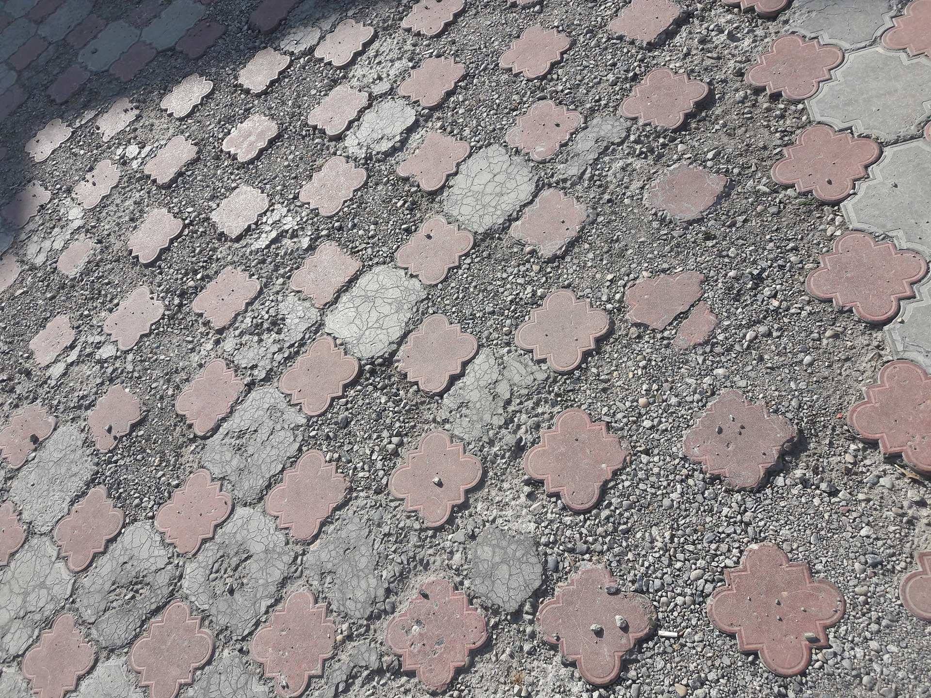 Однако отвратительный замес цемента - сказывается на плитке любой формы. И вот так тут на местной "Театральной" площади выглядит плиточное покрытие, которое спешно сдирают.