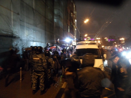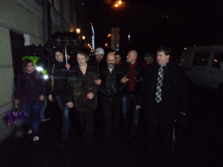 В сопровождении "космонавтов", периодически останавливаемые, левые активисты, распевая "Варшавянку", "Смело, товарищи, в ногу" и другие революционные песни, прошли по тротуару маршем. Полицейские поначалу даже не давали людям пройти в другой вход в метро, который ближе к "Макдональдсу". Но в конце концов уступили. На площади, где сгрудились участники мероприятия, под крики "Позор" началось винтилово. Были задержаны главный редактор ФОРУМ.мск Анатолий Баранов, активисты Революционной рабочей партии Александр Зимбовский и Дмитрий Сидоров, член исполкома МОК Денис Зоммер, активист МОК из Нижнего Новгорода Николай Николаев, активист РРП из Тольятти Лев Лямшин и левый активист Михаил Исполатов.