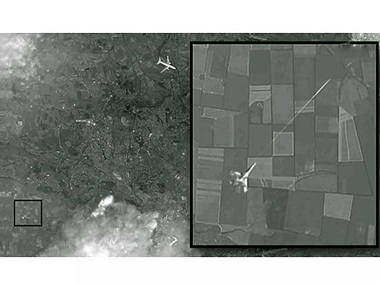 Но главный вопрос во всей этой историb ставит информация, озвученная Михаилом Леонтьевым на Первом канале. Были продемонстрированы спутниковые снимки, на которых зафиксирован пуск ракеты «воздух-воздух» по гражданскому самолету. Утверждается, что это атака на малайзийский «Боинг», совершавшему рейс MH-17, и который был сбит над Донецком 17 июля. Как сообщается, снимки были сделаны иностранным спутником-шпионом. Ведущий программы Михаил Леонтьев сообщил, что снимок поступил 12 ноября из-за рубежа в распоряжение российского союза инженеров, ранее опубликовавшего доклад об исследовании причин июльской катастрофы рейса MH-17. На фото видны пассажирский лайнер и истребитель, из-под левого крыла которого тянется инверсионный след, характерный для ракет «воздух-воздух».