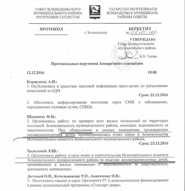 «Организовать работу отдела опеки и попечительства исполкома Зеленодольского муниципального района по изъятию несовершеннолетних детей, проживающих в жилых помещениях с задолженностью за энергоносители...» - сказано в протокольном поручении, подписанном Тыгиным по итогам аппаратного совещания от 12 декабря 2016 года.