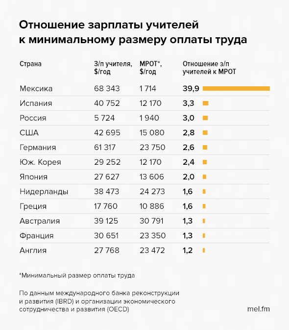 Издание отмечает, что сами по себе такие цифры не имеют особого смысла так как в разных странах разные налоги, стоимость жизни и нормы заработка. Поэтому для наглядности оно сравнило доход учителей с минимальными размерами оплаты труда в этих же государствах. Этот график показывает, насколько быть учителем прибыльнее, чем заниматься самой дешёвой работой в стране.