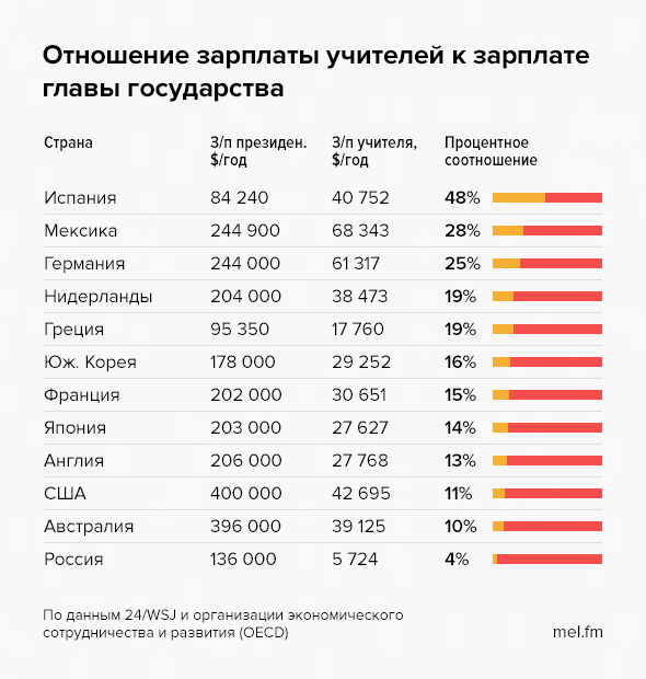 Также издание сравнило зарплаты учителей и официальные зарплаты глав государств.