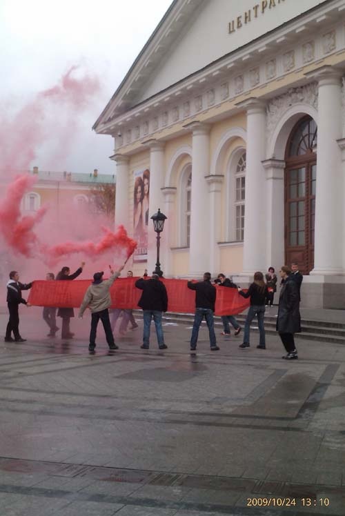 Как рассказал координатор Левого Фронта Сергей Удальцов, около 13.00 активисты Левого Фронта (15 человек) подошли к зданию Манежа, развернули транспарант «Ваша роскошь - нищета миллионов!», зажгли дымовые шашки и начали скандировать «Когда вы нажретесь, миллионеры?», «Капитализм - это кризис!».