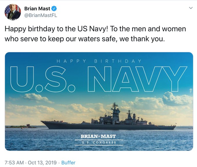 Член Конгресса США, ветеран войны в Афганистане Брайан Маст поздравил военный флот своей страны с годовщиной основания. В качестве фотографии для открытки политик, видимо, ошибочно использовал снимок российского ракетного крейсера «Пётр Великий». С целью затруднения идентификации судна создатель открытки замазал бортовой номер крейсера. При этом не заметил, что на корме виден андреевский флаг.