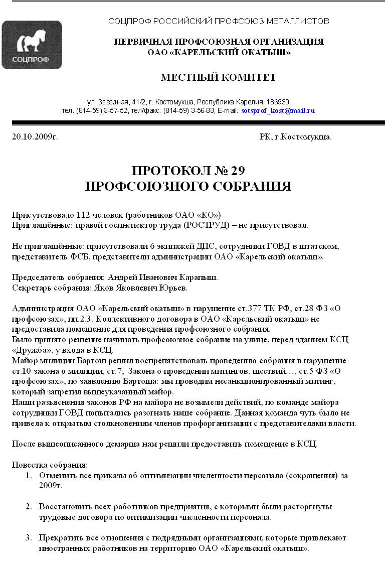 В начале собрания был зачитан ответ генерального директора ОАО «КО» Максима Воробьёва на приглашение участвовать в данном мероприятии. Ответ гласит: «В связи с запланированной встречей с активом ГМПР, представляющим большинство работников ОАО «Карельский окатыш», не могу принять участие в вашем собрании». Ответ убедительный, конкретный: есть актив, с которым гендиректор желает разговаривать, а есть пассив, с которым не желает,- именно так восприняли данное послание собравшиеся.
