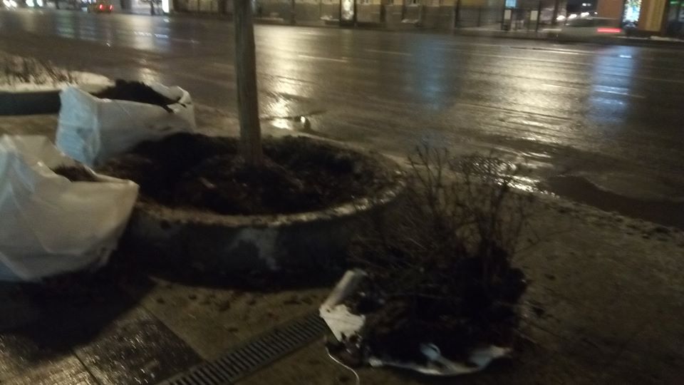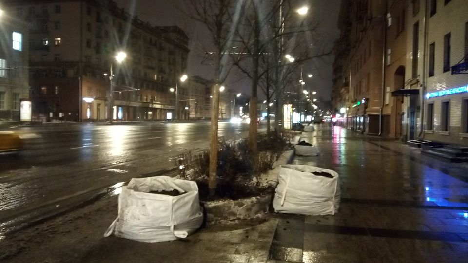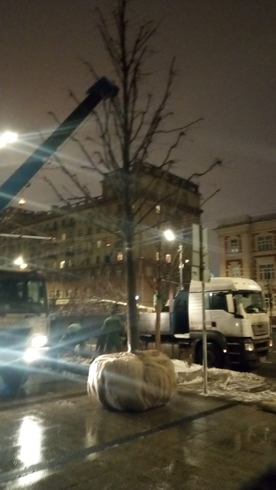 Ночью 5 декабря на Садово-Кудринской рабочие ЖКХ сажают деревья. Выкапывают старые и сажают новые. Эффективное хозяйствование в цвету.