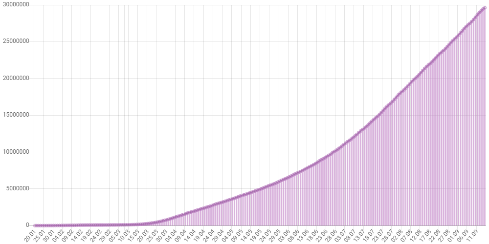 Как видим, никакого плато не наступило ни в начале лета, ни в конце, ни осенью. Идет неуклонный поступательный рост заражений, причем статистика мировая - в одной стране можно фальсифицировать, но во всем мире?..
