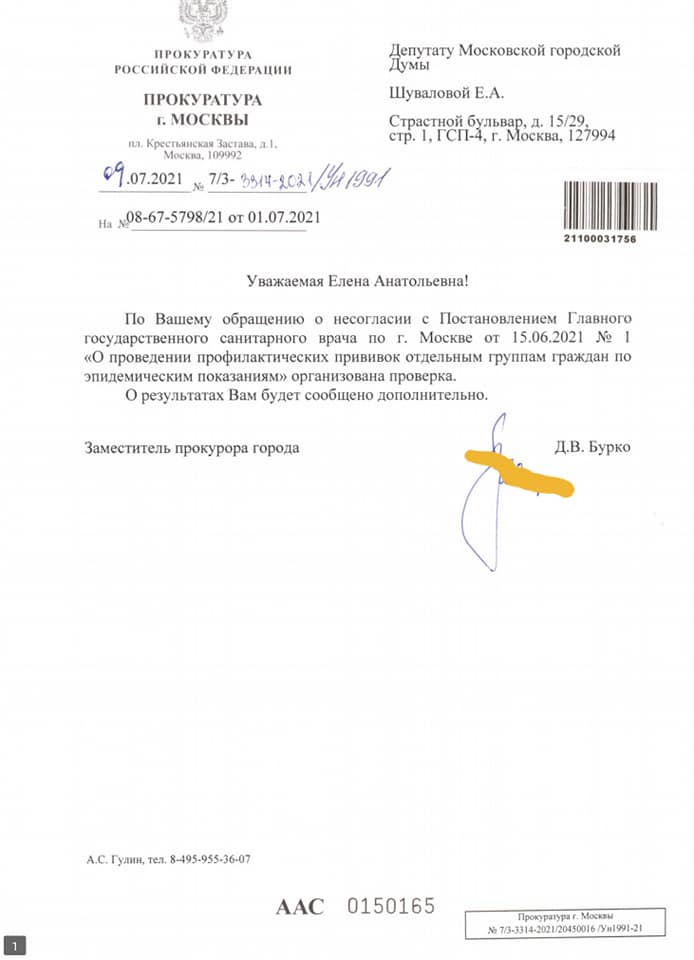Проверка по моему обращению в правоохранительные органы - имела ли Андреева право в качестве Главного санитарного врача Москвы подписывать так называемое Постановление о вакцинации продолжается.