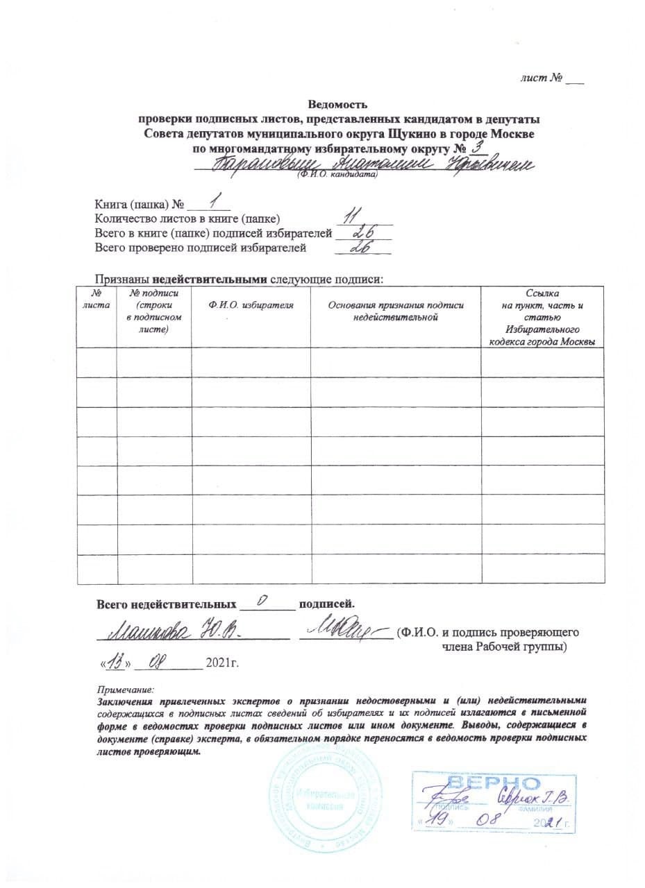 Называется он "Ведомость проверки подписных листов". И написано там, что из всех 26 подписей в мою поддержку, предоставленных в избирком, недействительных - ноль! Все подписи подлинные!