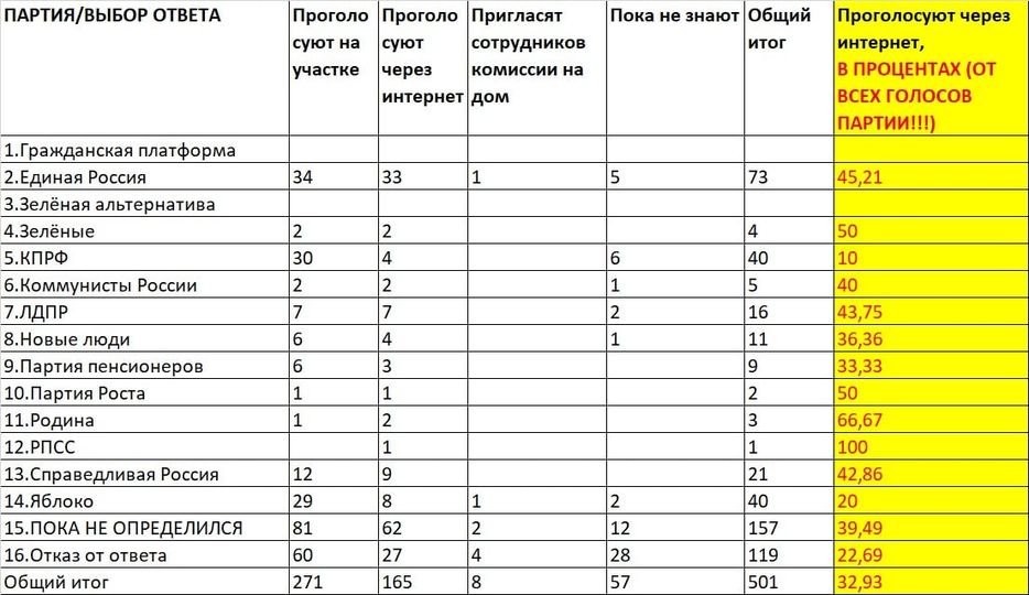 Итак, прозвонили 501 мобильный московский номер. Вопросов, кроме базовых (гражданство, возраст, москвич/не москвич) было два. Первый: «Если вы решите принять участие в выборах в Госдуму, каким способом вы готовы проголосовать?»