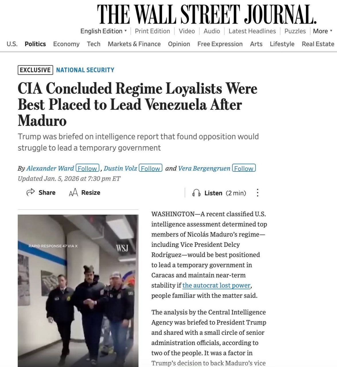 The Wall Street Journal пишет о том, что администрация США фактически «кинула» демократическую оппозицию Венесуэлы. Единственной силой, по мнению Трампа, способной удержать страну от немедленного хаоса после устранения диктатора Мадуро, остается… администрация диктатора Мадуро и весь его репрессивный аппарат. Оппозиция же, напротив, рассматривается как политически несостоятельная.