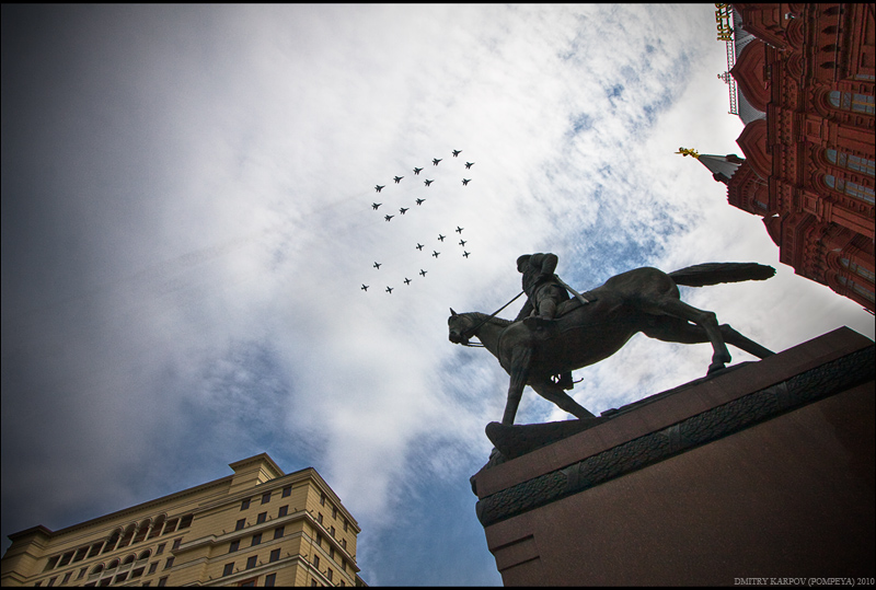 В инете - потрясающие фотки. Снято гениально, а вот что снято - это с ума сойти. Целая пилотажная группа на разных типах самолетов летит над центром столицы в виде цифры "65". Даже не на генеральной репетиции, а просто... Отрабатывать движение нужно почему-то прямо над центром Москвы.