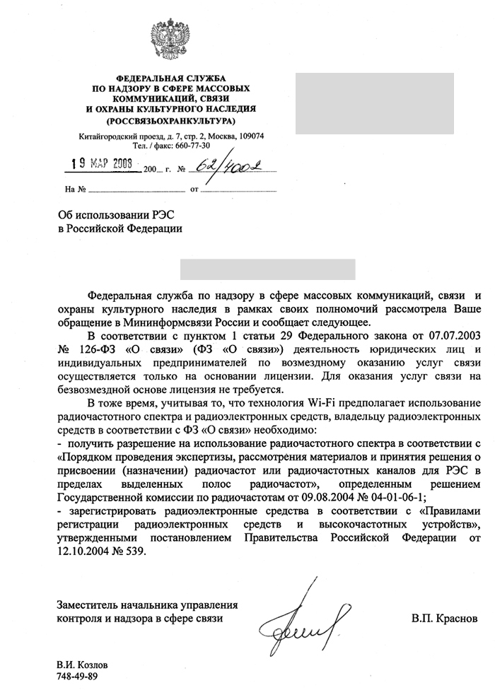 В ответе на запрос журналиста «Фонтанки» заместитель начальника Управления контроля и надзора в сфере связи Владимир Краснов заявил, что владельцу радиоэлектронных средств технологии Wi-Fi необходимо получить разрешениена использование радиочастотного спектра, а также зарегистрировать оборудование.