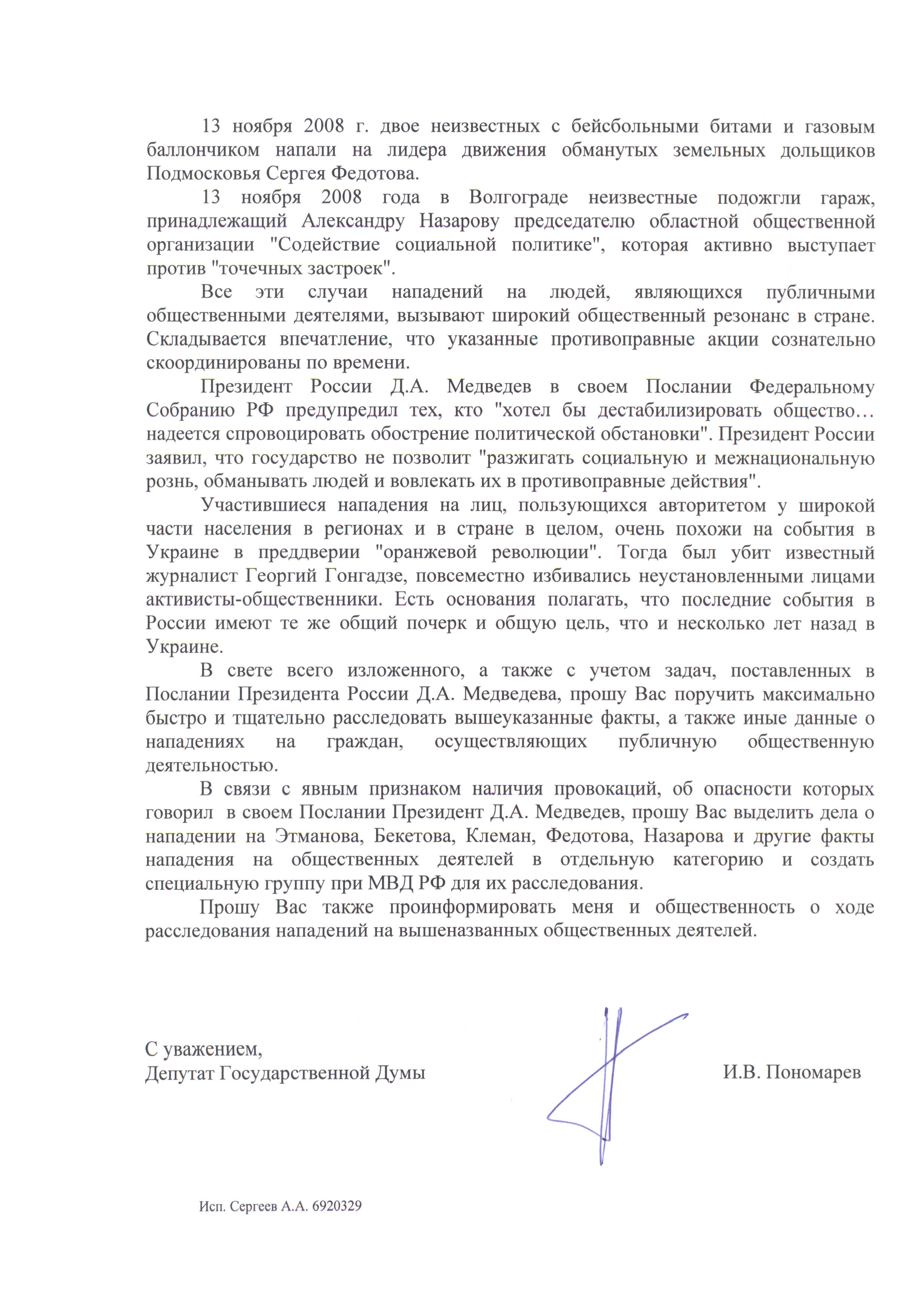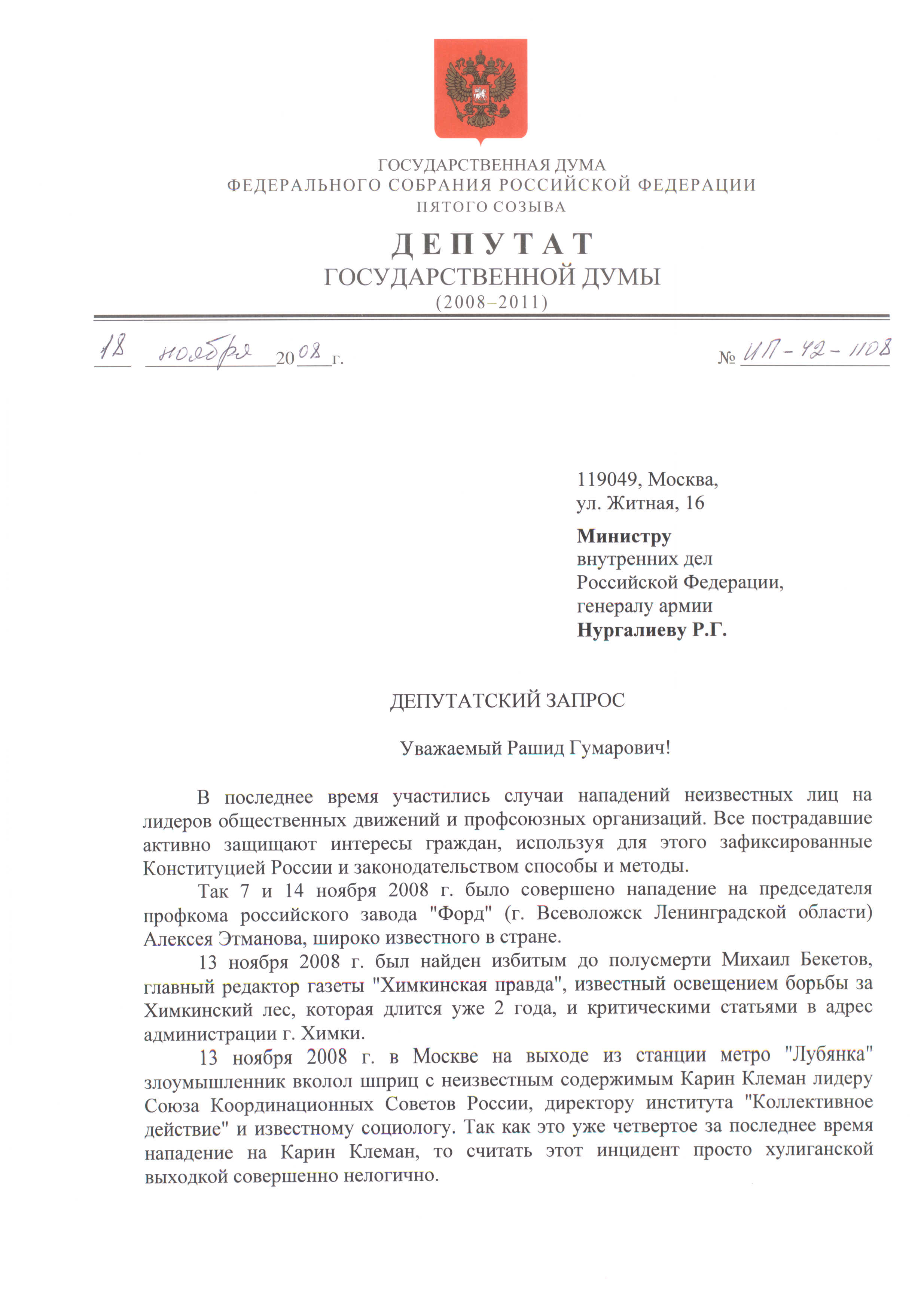 Запрос депутата И.В.Пономарева министру внутренних дел Р.Г.Нургалиеву