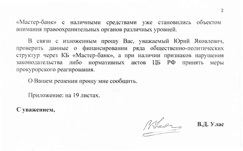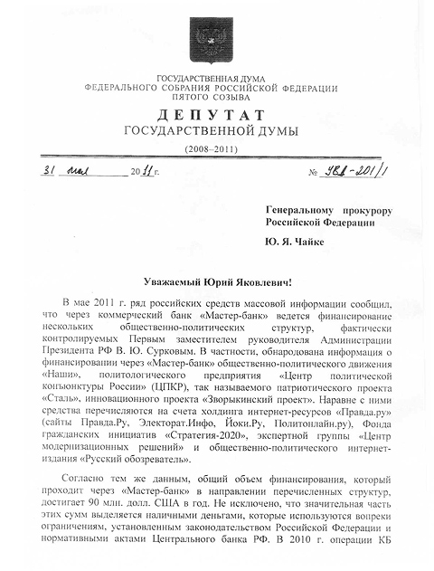 Депутат Государственной думы Владимир Улас (фракция КПРФ) направил генеральному прокурору Юрию Чайке запрос, в котором содержится просьба проверить финансирование ряда общественно-политических структур и интернет-СМИ через ««Мастер-банк»» и, при необходимости, возбудить уголовное дело, сообщает infox.ru.