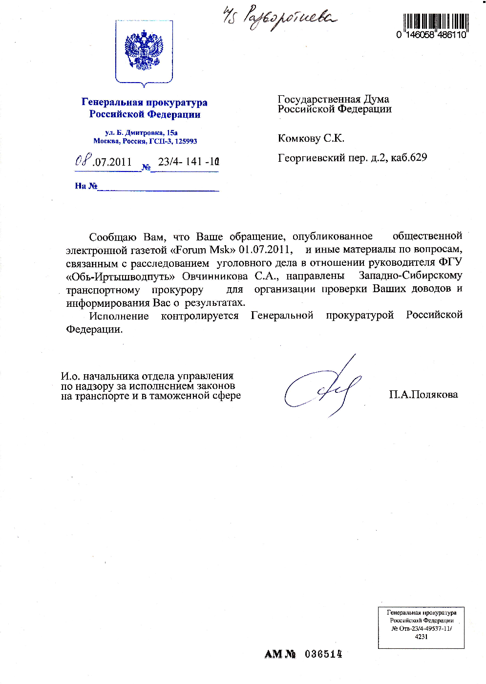 Более того, Сергею Комкову ответили не только из Генпрокуратуры, но и из Западно-Сибирской транспортной прокуратуры: