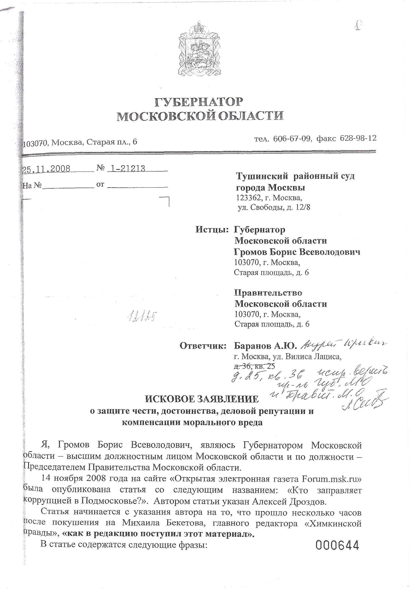Иск губернатора Московской области Бориса Громова к журналисту Анатолию Баранову о защите чести, достоинства и деловой репутации постепенно превращается в политический. Политика заключается в том, что практически всесильный глава крупнейшего региона выступает против частного лица - всей мощью вверенного ему административного ресурса: иск заявлен одновременно и от Губернатора (как "высшего должностного лица") и от Правительства области, а в качестве предствавителей истца заявлены сразу начальник правового отдела вкупе с заместителем. Баранов же выступает исключительно как частное лицо - не редактор, не владелец чего-либо, даже не как автор материала, а просто как обладатель доменного имени третьего уровня Forum.msk.ru.
