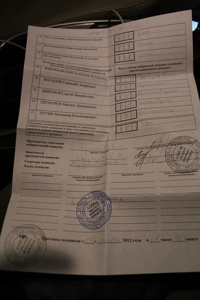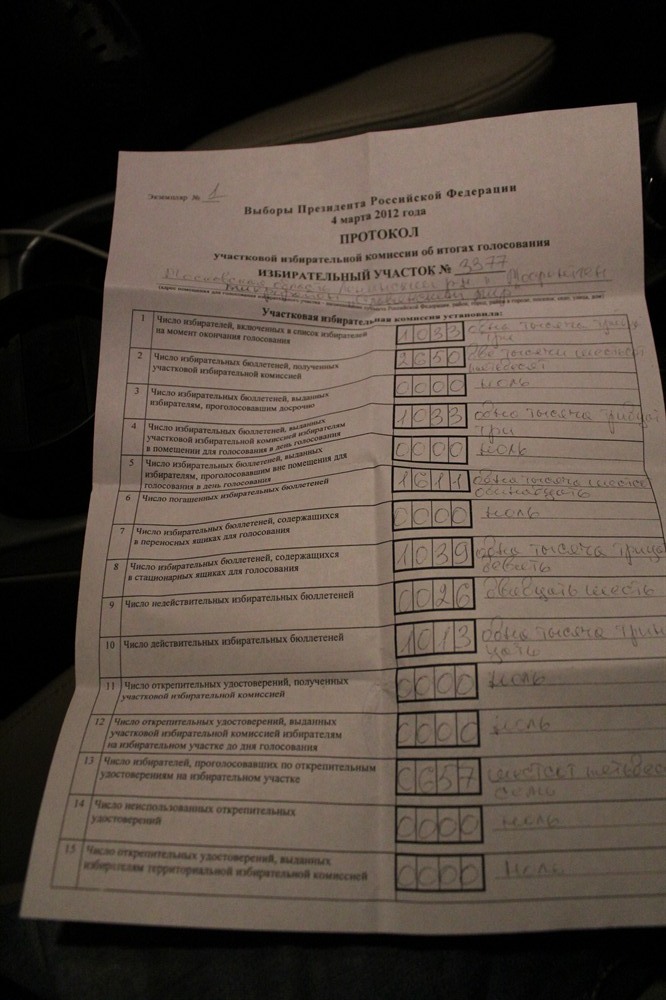 Как и по всей России в 20.00 начался подсчет. Из урны вынули несколько аккуратно сложенных пачек бюллетеней. Ножниц на участке не оказалось. Сотрудник полиции пытался их передать сквозь решетку вентилятора. Как-то вопрос с ножницами был решен. Увеличенная копия протокола председателем использовалась как черновик. Про флип-чарты он и не слышал. Расстелил прямо на столе и там же заполнял. Заполнять ему неудобно. «Большой» протокол сворачивается в трубочку. По мнению некоторых наблюдателей он вообще не понимает зачем нужна увеличенная копия протокола. Ведь есть же маленький протокол.