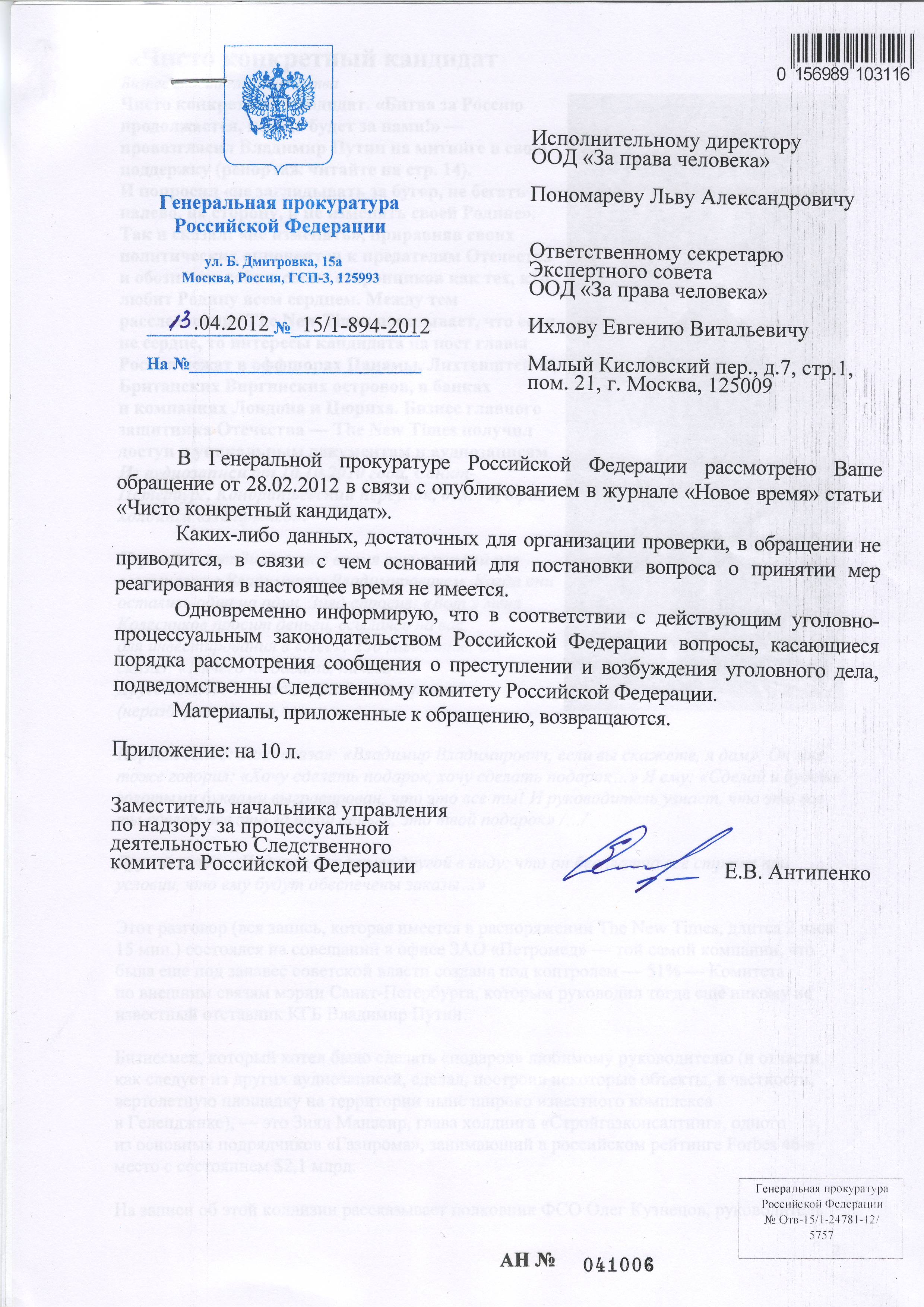 13 апреля (исх. 15/1-894-2012) заместитель начальника управления по надзору за процессуальной деятельностью Следственного комитета РФ Е.В.Антипенко сообщил, что:"Каких-либо данных, достаточных для организации проверки, в обращение не приводится, в связи с чем оснований для постановки вопроса о принятии мер реагирования в настоящее время не имеется".