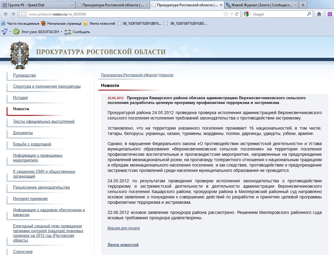 Если сама "прокурора" Кашарского района, а вслед за ней Миллеровская районная суда и "прокурора" Ростовской области озабочены состоянием работы по профилактике терроризма и экстремизма в Верхнесвечниковском сельском поселении отдаленного Кашарского района Ростовской области, населению всей области, можно не опасаться экстремистских угроз...