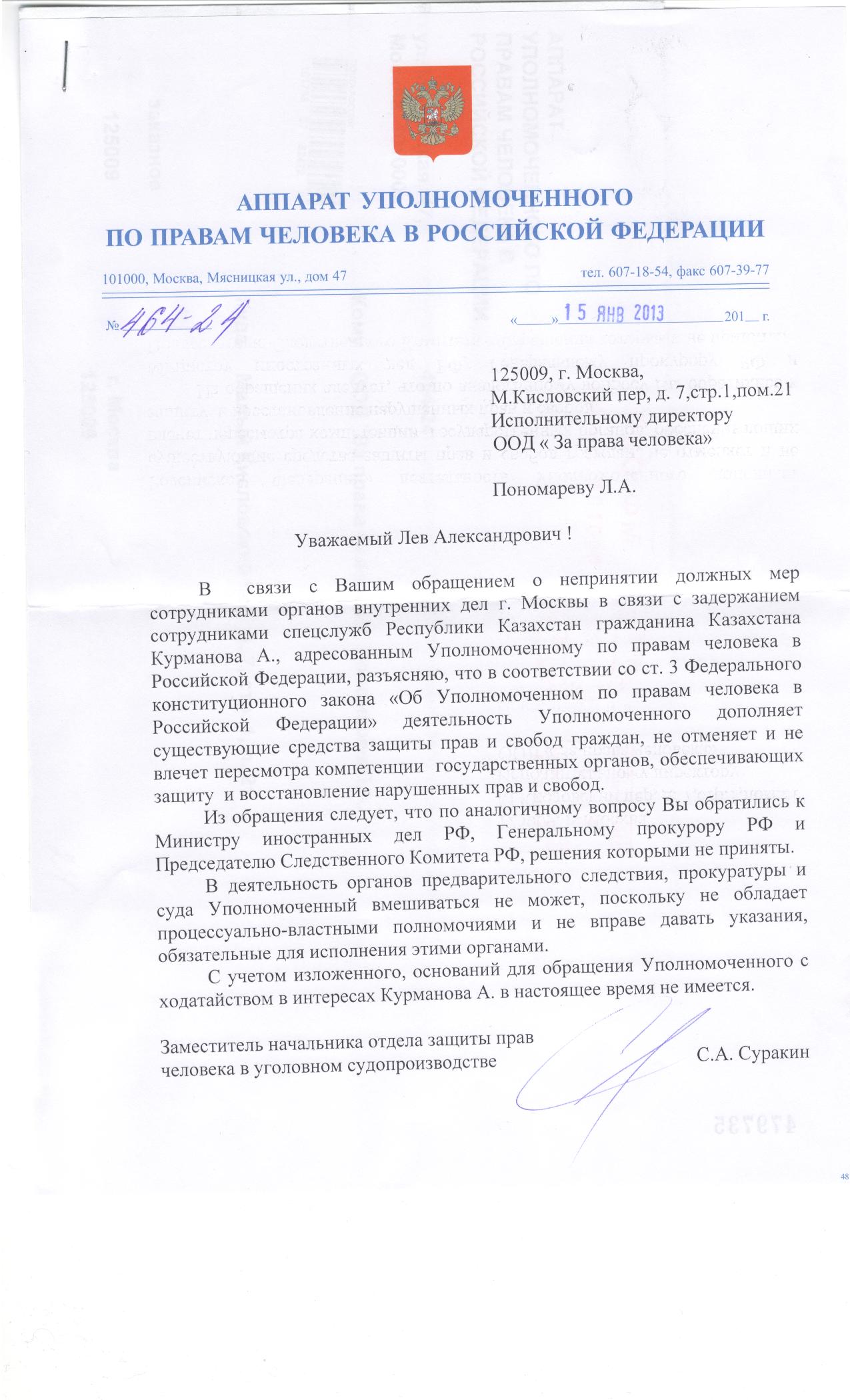 В ответ на запрос руководителя ООО "За права человека" Льва Пономарева к Уполномоченному по правам человека в РФ, из аппарата уполномоченного пришло письмо, в котором содержится, по сути, отказ заниматься этим делом.