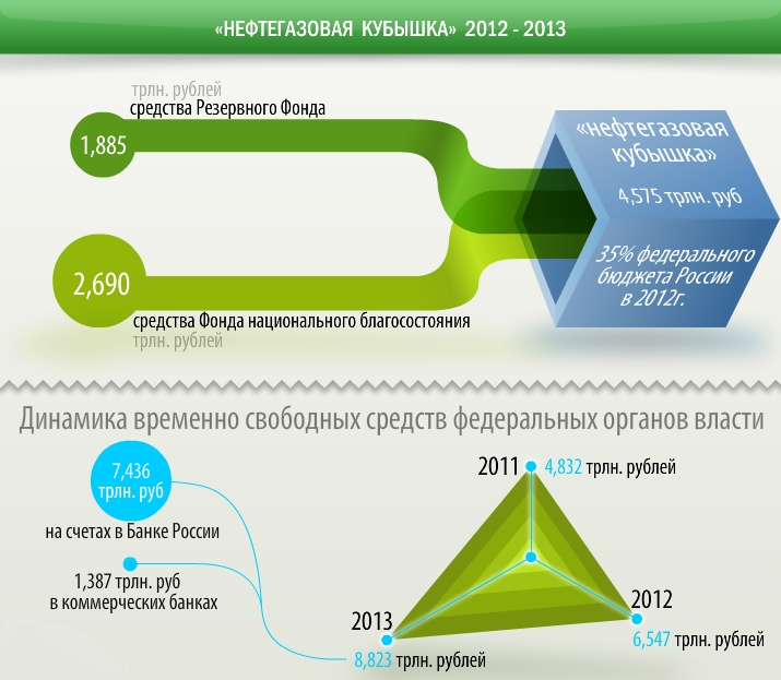 Прежде всего, нужно чётко понимать о каком порядке цифр идёт речь и какого масштаба активы будут выведены из под контроля государства. Согласно официальным оценкам Банка России, размер средств Резервного Фонда за период с 1 января 2012г. по 1 января 2013г. подскочил в 2,32 раза и достиг отметки в 1,885 трлн. рублей. Объем средств в Фонде национального благосостояния по состоянию на начало 2013. составляет порядка 2,690 трлн. рублей. В совокупности в российской нефтегазовой «кубышки», в угоду которой Минфин ежегодно изымает из отечественной экономики свыше 3-5% ВВП (в лучшие годы 7-10% ВВП) и поддерживает хроническое недофинансирование экономики, ЖКХ, образования и здравоохранения, по состоянию на начало 2013г. без дела лежит свыше 4,575 трлн. рублей. Это эквивалентно 152,5 млрд. долл. или 35% федерального бюджета России в 2012г.