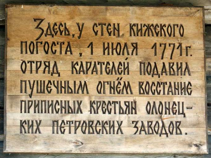 Любопытно, рассказали ли экскурсоводы в «Кижах» «Великой княгине», как по приказу представителей «Императорского дома Романовых» здесь из пушек расстреливали русских и карельских крестьян? Это было 1 июля 1771 г., когда около 2 тысяч крестьян, протестовавших против резкого ухудшения своей жизни, увеличения подушной подати, собрались на сход у стен Кижского погоста. Тогда карательный отряд под командованием полковника князя Урусова при помощи пушек рассеял толпу, зачинщиков выслали в Сибирь и для острастки каждый 20-й житель Заонежья был высечен батогами.