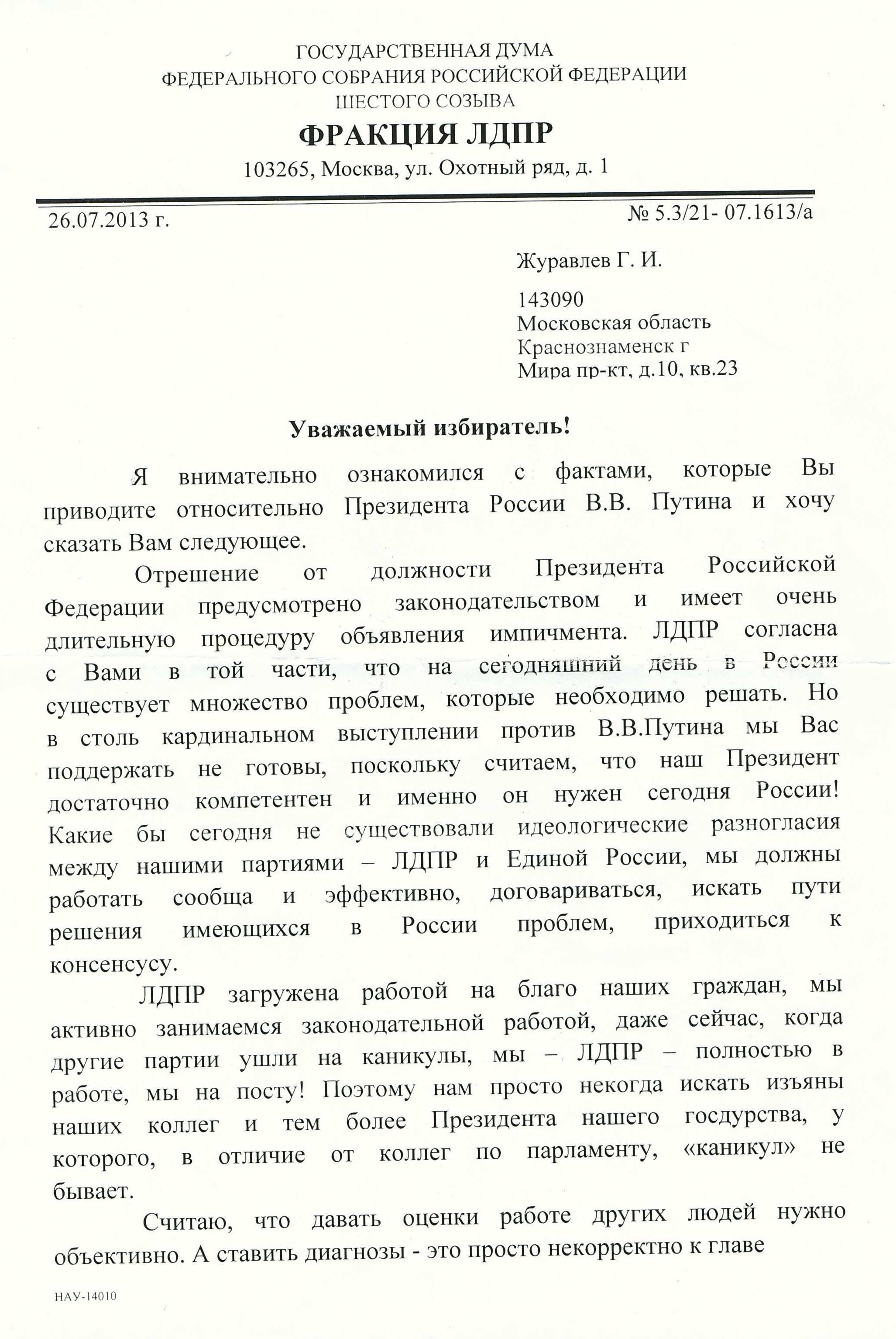 К моему удивлению, на наше с Журавлевым письмо, помещенное на сайте чуть ранее http://ymuhin.ru/node/952/sr-nashe-vam-s-kistochkoi, очень быстро ответила не только «Справедливая Россия», но и ЛДПР. Однако ответила не на мое имя, а Г.И. Журавлеву. Ответ в стиле «резинового» Полыхаева из «Золотого теленка» и даже круче, поэтому стоит того, чтобы быть помещенным во всей красе.