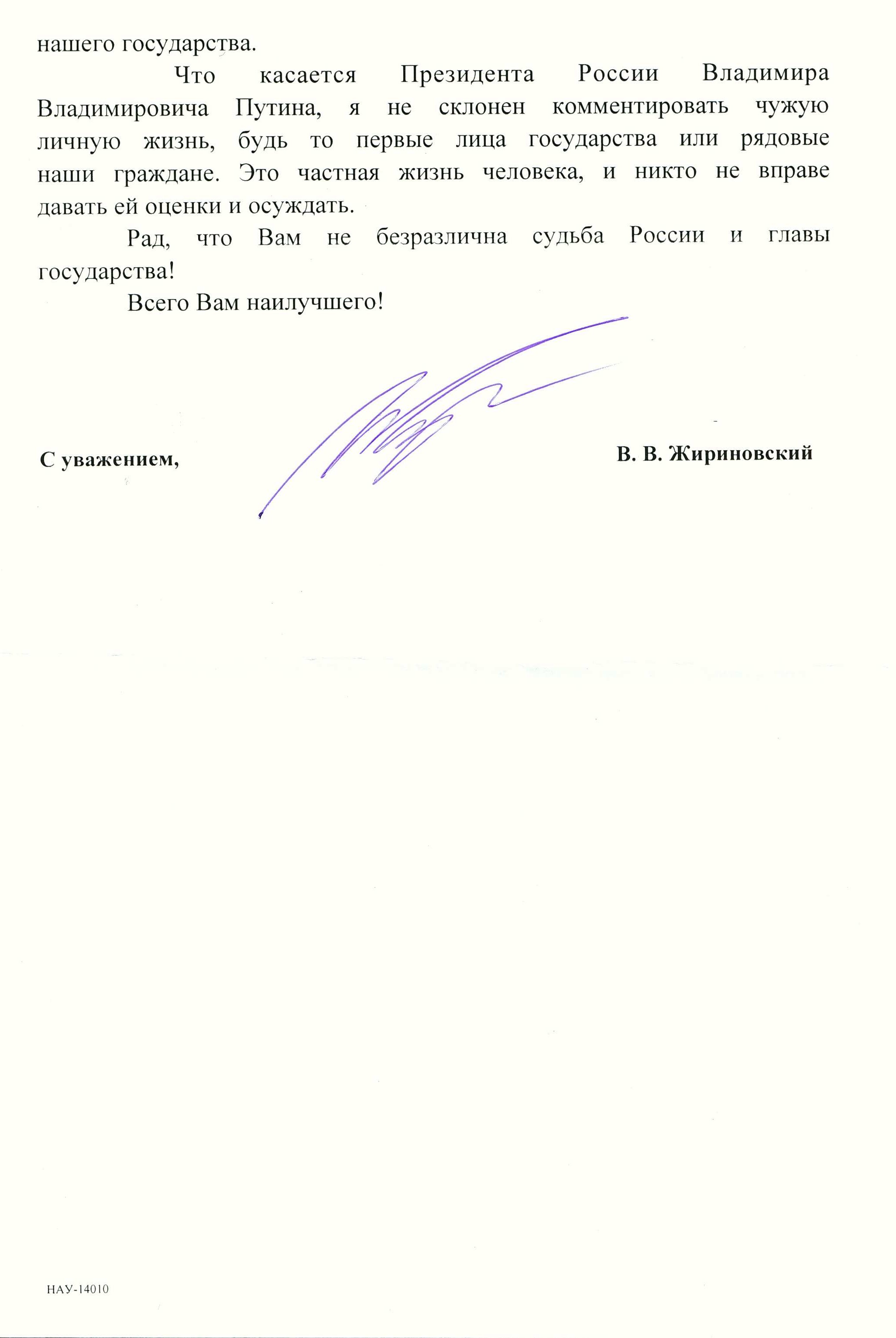Вот посмотрите на это письмо. Дело даже не в том, что Жириновский его лично подписал, а в том, что оно и по стилю его. То есть, либо он его лично и написал, либо у него помощники умело копируют стиль самого Жириновского. Но мне кажется, что ответ надиктовал сам Жириновский. Почему?