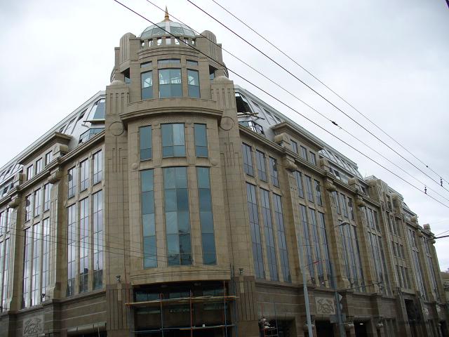 Находите ли вы тут что-либо общее? Нет. Тупая глыба. Есть характерная особенность истуканской архитектуры - прозрачные купола любят наши воцерковленные буржуи, готовые каждый сантиметр оборудовать под извлечение прибыли. Самое изящное и загадочное из исконного военторга - кубическая башня, напоминающая о родстве с конструктивизмом - исчезла. На ее месте "кумпол" - именно башка какая-то, прозрачная в районе темени.