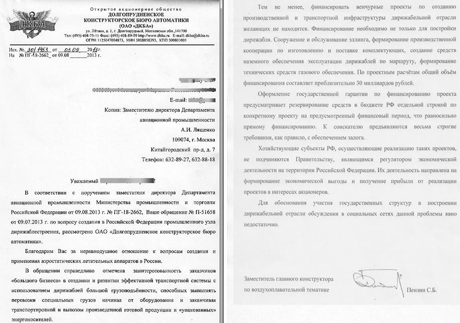 Договорились, что наверх будет отправлена отписка, в которой будет указано, что запрос пришёл не по адресу и что вопрос нужно серьёзно обсуждать в других ведомствах с привлечением экспертного сообщества (я по крайней мере настаивал на такой формулировке). Видимо, в ДГА мой месседж попал через «канал» путинской администрации. А вот по «каналу» аппарата Медведева мой месседж отфутболился в Минпромторг. Оттуда -- по-старинке -- его спустили в нынешнее ОАО «Долгопрудненское КБ автоматики», которое до 2011 г. было ещё самостоятельным ФГУП, а ныне входит в радиостроительный холдинг «Вега». Надо сказать, что тема дирижаблей очень болезненно воспринимается в «ДКБА». С одной стороны, начальство никак не хотело бы потерять лицо, позиционируя себя в качестве лидера воздухоплавательной отрасли, что обусловлено исторической причастностью к легендарному комбинату "Дирижаблестрой", а с другой, тема современного развития дирижаблей требует именно активного участия в бизнес-проектах дирижабельной направленности, инициировании таковых. А вот этого последнего как раз-таки в нынешнем «ДКБА», по большому счёту, почти что и не наблюдается.