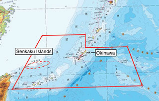 Административные права на все острова, расположенные в районе между прямыми линиями на карте, были возвращены Японии в 1972 году в соответствии с "Соглашением о возвращении Окинавы". Острова Сэнкаку входят в этот район