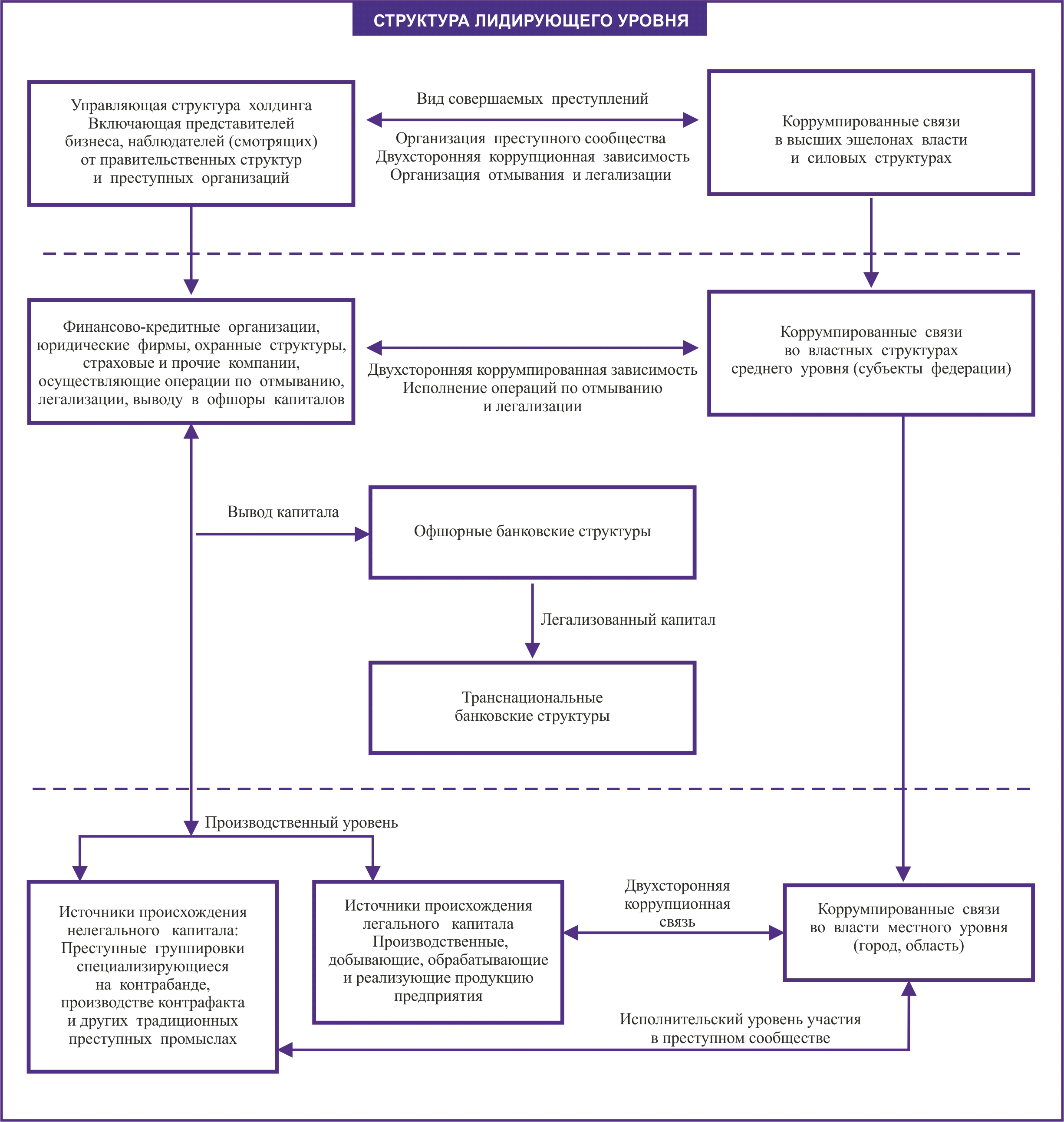 Организованные преступные группировки, становясь криминальными крышами крупных бизнесменов, используют их коммерческие структуры для проведения операций по отмыванию и легализации преступно нажитых капиталов. Ниже, приведена стандартная схема организации преступного экономического холдинга, которой пользуются, все, без исключения олигархи России, Украины, и других республик бывшего СССР и Восточного блока. Данная матричная схема растиражирована, и, видимо, перенята у западных партнеров, правительствам, которых стоит задуматься о ликвидации таких холдингов в законодательном порядке, потому что основная цель их деятельности, это отмывание и легализация доходов, полученных любым путем, включая традиционно-преступные. Конечными целями движения капитала в такой схеме является офшорная зона, и попадание легализованной части этого капитала на счета ведущих мировых банков, что для стран, в которых находятся такие банки, равносильно фальшивомонетничеству, т.к. является притоком необеспеченного материальными ценностями капитала, подрывающего экономику этой страны.
