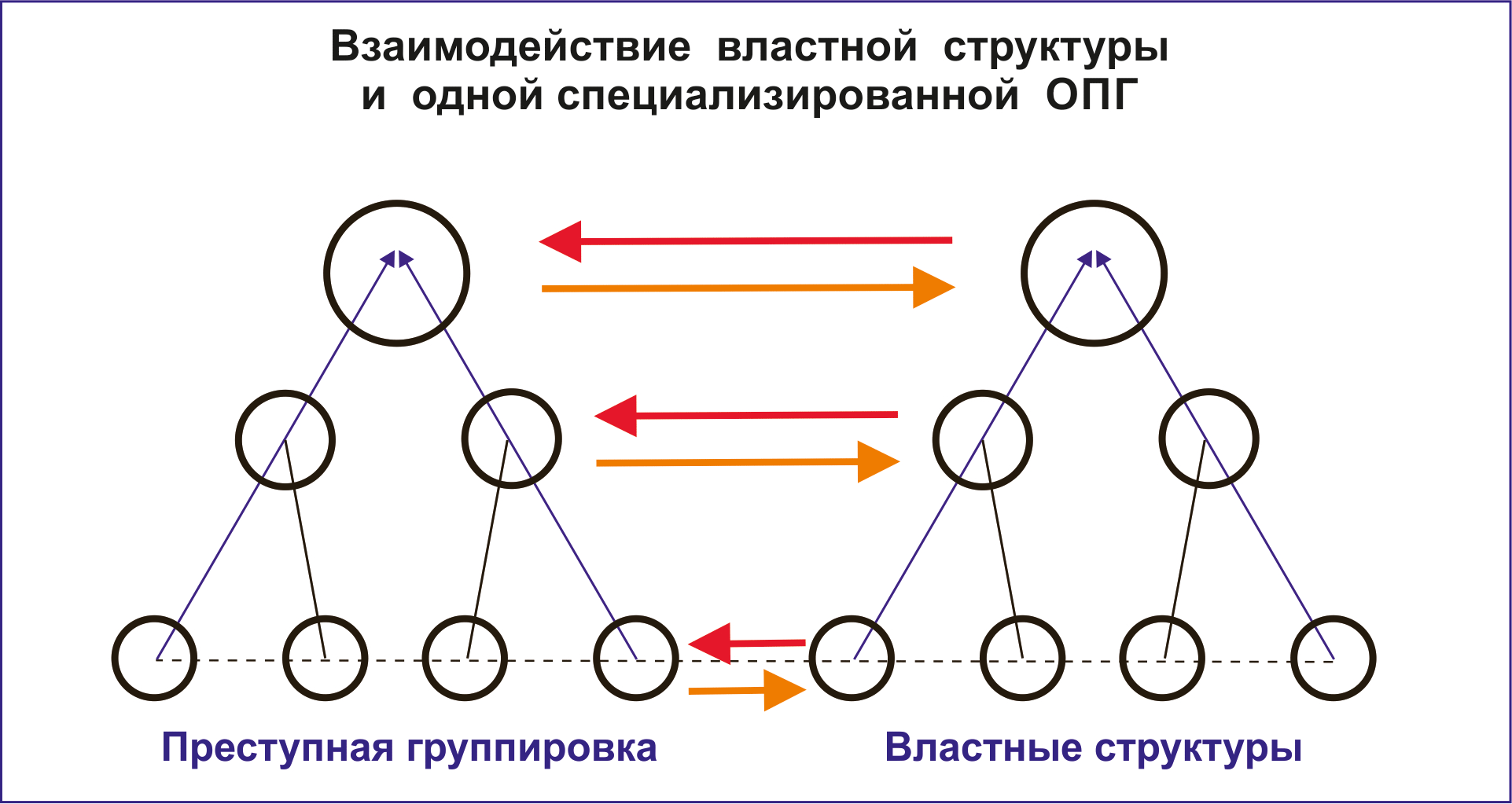 Синим цветом, указано направление денежных потоков, чёрным – направление товара. Длина и толщина стрелок условно показывает на уменьшение объема денежной и товарной массы, от ступени к ступени, вниз. Диаметры окружностей условно показывают на концентрацию денежно-товарных масс в руках членов сообщества, и характеризуют денежную массу, обозначаемую D1…..Dm-n. Отношения D1 /D2 / D3 зависят от принятого масштаба. По мере своего роста и развития организованная преступная группировка обрастает связями с правоохранительными, а через них и властными структурами на разных уровнях, жёстко выстраиваясь снизу доверху.