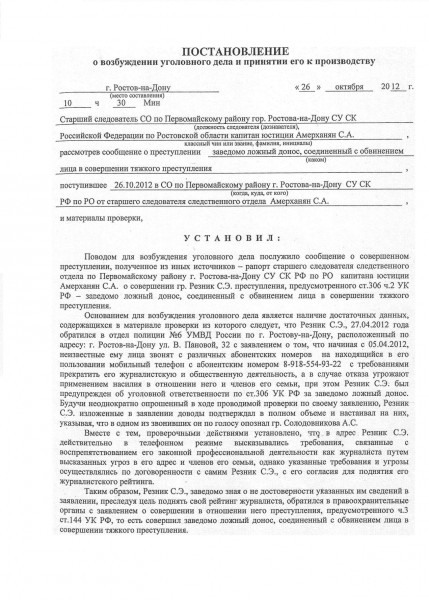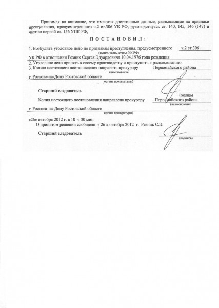 Старший следователь Саркис Амерханян подписал постановление о возбуждении в отношении Сергея Резника уголовного дела по ч. 2 ст. 306 УК РФ (заведомо ложный донос, соединенный с обвинением лица в тяжком преступлении).